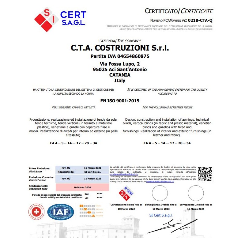 I prodotti CTA sono interamente progettati e prodotti in Italia, il risultato è una tenda di elevatissime prestazioni, studiata per durare nel tempo.