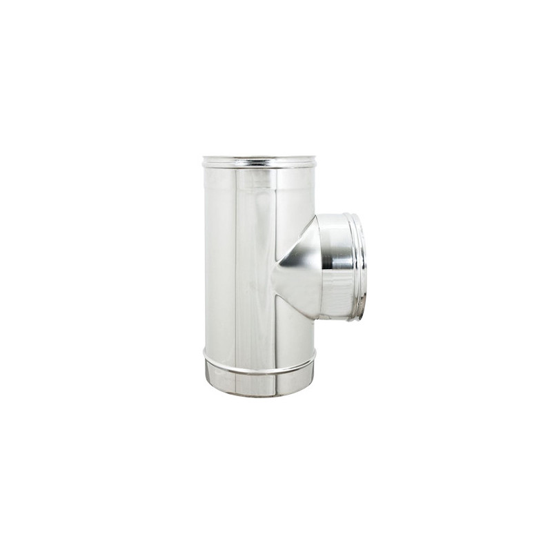 Raccordo a T in acciaio inox Ø25 cm con attacchi femmina-femmina-maschio, progettato per l'espulsione dei fumi da stufe e caldaie.