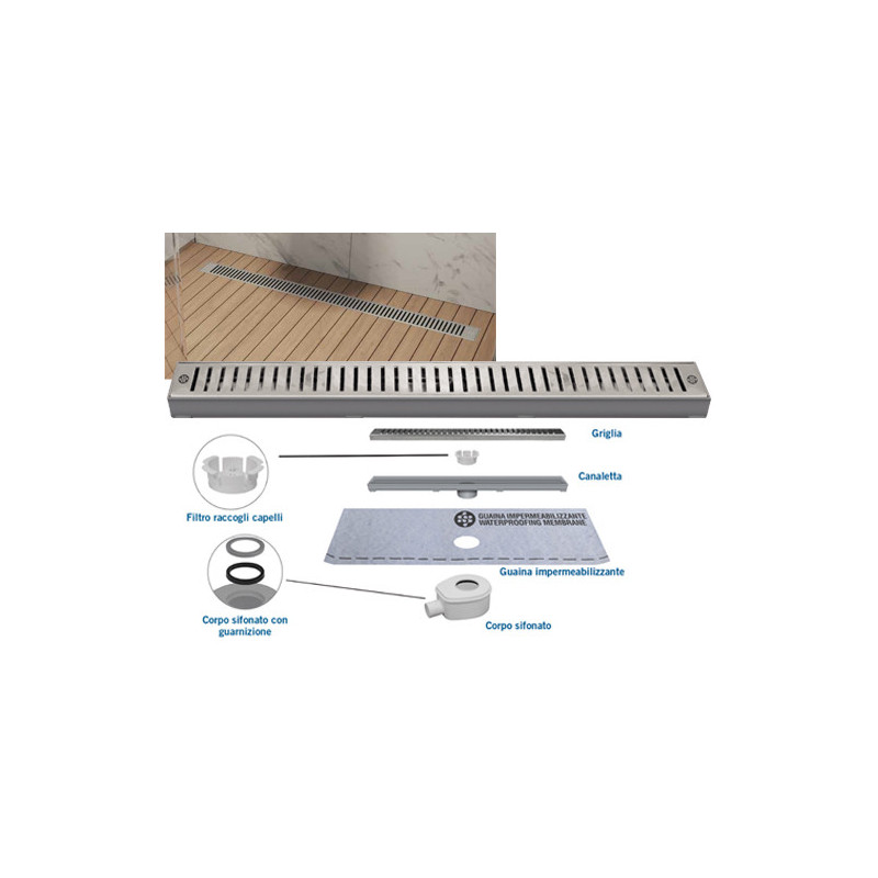 La canaletta doccia ABS 65 cm CN60-01 è progettata per scarico lineare a filo pavimento.