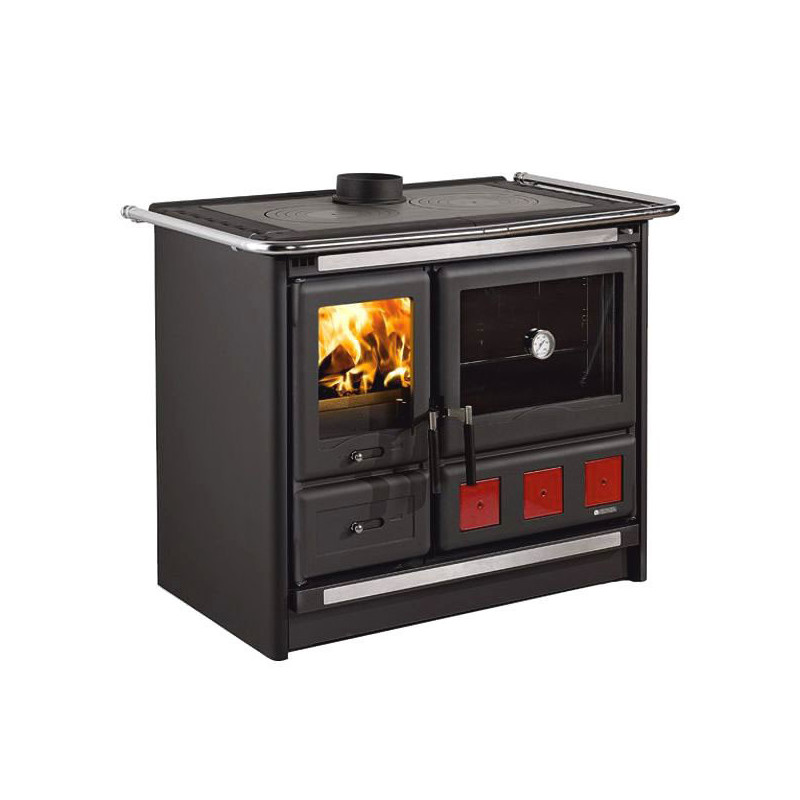 La struttura è in ghisa smaltata con focolare refrattario, piastra in ghisa levigata, rivestimento in acciaio porcellanato; portina focolare con doppio vetro, cassettone portalegna e griglia forno cromata completano la dotazione.