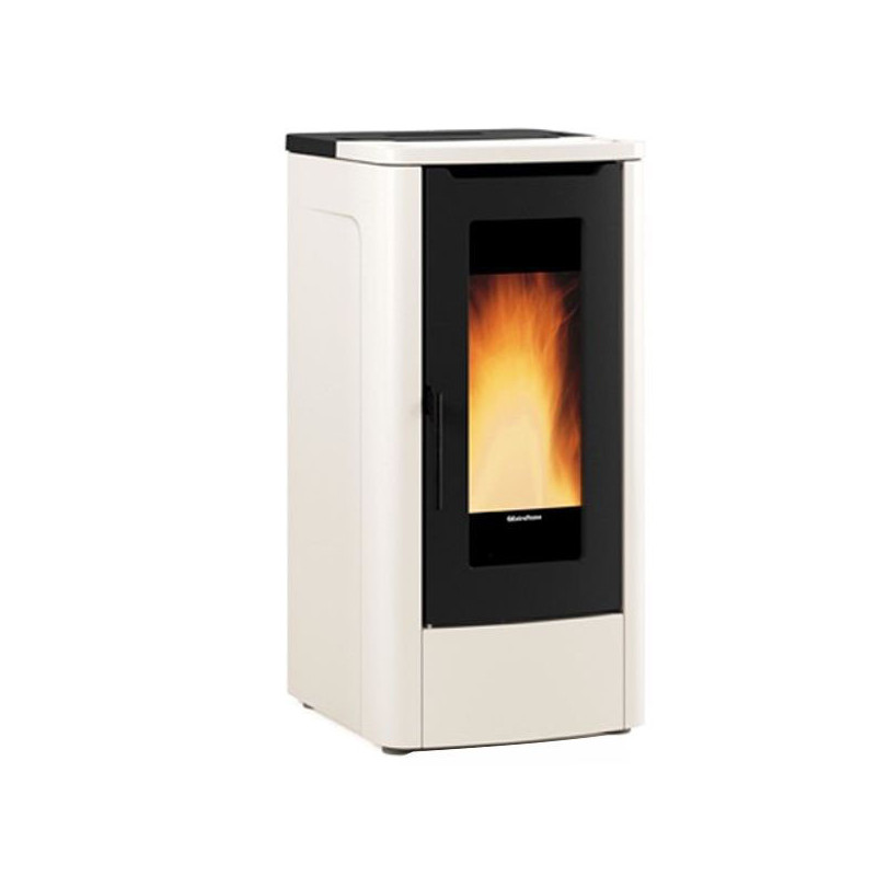 La stufa a pellet modello Teorema finitura Avorio offre un’efficiente potenza da 3,0 a 12,0 kW e un consumo pellet da circa 0,7 a 2,3 kg/h.